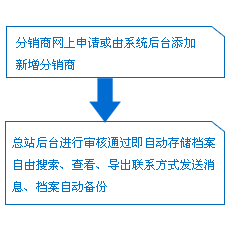 *分销商常规管理:分销商电子档案自动存储备体系让档案无需再录入备份;精细搜索功能可按时间、联系方式、名称等众多条件精准搜出您想找的分销商;实用的导出和群发模块让通知、广告变得更加快捷和精准;